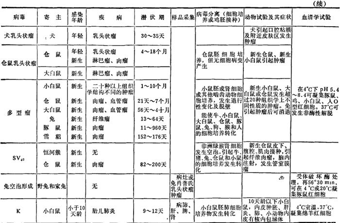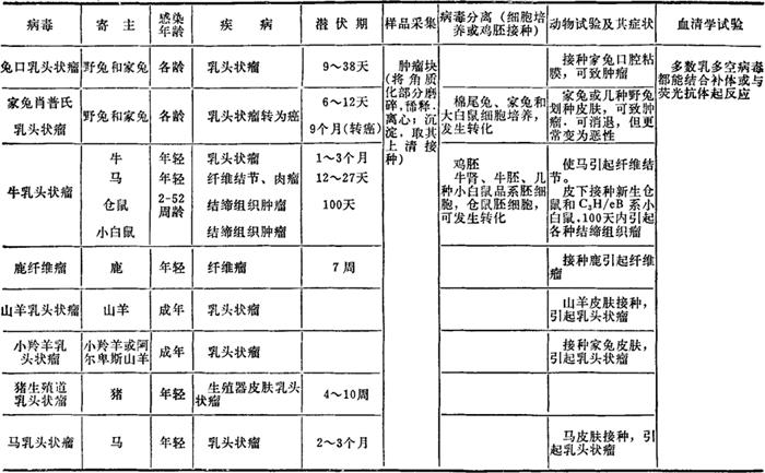 | 释义 | 乳多空病毒科 乳多空病毒科由乳头状瘤病毒(PapillomaVirus)、多型瘤病毒(PolyomaVirus)和空泡形成病毒(Vacuolating agent)三类病毒所构成。它的名称就是这三类病毒名称的头一个字(英文则为头两个字母)缩拼而成。 乳多空病毒的基因组为环状双股DNA;病毒子无囊膜,二十面体对称,直径为45~55nm,有72个壳粒,亦有呈丝状的病毒子;在CsCL中的浮密度为1.32g/ml,对乙醚、酸和热有抵抗力。乳头状瘤病毒尚不能在细胞培养中生长。不同毒种的抗原性不同,但同属成员则有共同抗原。 本科成员都有致肿瘤能力,引起隐性或慢性感染,通过接触或空气传播。乳头状瘤病毒可由节肢动物机械传播。本科包括两个属,即乳头状瘤病毒属和多型瘤病毒属。前者较大(55nm),在其自然宿主体内常引起良性乳头状瘤,偶发恶性变;后者较小(45nm),具血凝性。病毒DNA常整合到感染细胞的染色体中使其转化,对新生仓鼠和其他一些异种动物会呈现致瘤性。 由乳多空病毒引起的常见的各种动物的疾病及其实验诊断要点,列表如下。 表34-1 乳多空病毒引起的动物疾病及其实验诊断要点