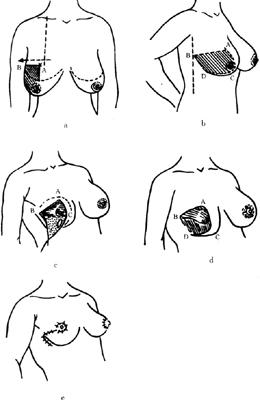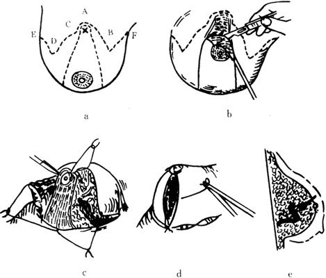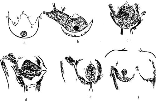 图20-2 水平双蒂法 a.切口设计 b.去除水平蒂上皮组织 c.切除FG区皮肤乳腺组织 d.自胸壁上分离双蒂组织 e.缝合乳腺组织 f.缝合后 (2)去除水平蒂的上皮组织。 (3)切除新乳头、乳晕区的皮肤、皮下组织和腺体,深度直达胸大肌筋膜。 (4)沿外形线将D、F、H、G、E诸点部位之内的皮肤及乳腺组织全层切除,深达胸大肌筋膜。 (5)将水平真皮-乳腺组织瓣自胸大肌筋膜上分离。 (6)水平真皮-乳腺组织瓣蒂部的真皮层可予切开,便于乳头、乳晕转移到新的位置。 (7)将E点、D点与乳房下皱襞线的H点先缝1针。 (8)将乳晕固定于新的位置,最后缝合所有创口。 宋儒耀氏缩乳术 上述3种缩乳术在适应症选择得当和根据各个患者的具体情况做必要的修改的前提下,一般都能形成外观美好的新乳房。不过,这些西方学者的手术方法应用于中国妇女的巨乳整形治疗,又都有一个严重的缺点,那就是它们都在乳房下皱襞和乳前正中遗有切口瘢痕,手术后此瘢痕易增生、变宽,既不美观又常刺痒,乳部正中的皮肤也较紧。宋儒耀在1963年,逐步对此手术做了3点改进:第一,不在乳房下皱襞和乳前中部做皮肤切口,而是在乳房外下部做皮肤切口;第二,不在乳房下部正中或两侧切除多余的乳腺组织,而在其下外1/4部切除过多的乳腺组织;第三,不用皮肤乳罩对乳房塑形和保持塑形后的形状,而是用腺体本身的包膜塑形和保持塑形后的新形态。 【手术步骤】 详见图20-3。