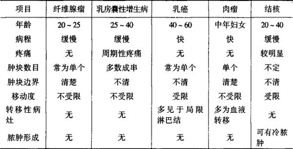 【诊断与鉴别诊断】 根据典型临床表现及某些特殊检查方法,多数病例诊断并不困难。但一些乳房良性病变、恶变或乳腺早期癌,有时诊断还是很困难的。 乳癌在乳房肿块中所占的比例很大,临床上被误诊为良性肿瘤的并不少见,所以,与常见乳房肿块进行鉴别有重要意义。活组织切片检查,是确定诊断最准确的手段之一。几种常见乳房肿块的鉴别见表3-2。 表3-2 几种常见乳房肿块的鉴别