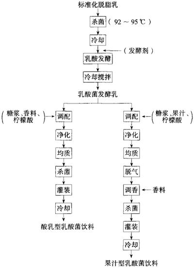 | 释义 | 乳酸菌饮料 1.乳酸菌饮料的原料 乳酸菌饮料是在由乳酸菌发酵的糊状或流态的发酵脱脂乳中添加糖、香料等并用水稀释而成的。按规定,乳酸菌饮料中的蛋白质含量应不低于0.7%。除乳酸菌外有时也使用酵母,饮料中的乳酸菌以活的状态存在,乳酸菌和酵母数应在106个/mL以上。乳酸菌饮料是一种保健饮料,有美容和保健作用。乳酸菌饮料主要原料有: (1)乳原料 使用质量优良的脱脂乳或脱脂乳粉的还原乳或半脱脂乳均可。非脂乳固形物含量一般15%~20%。 (2)乳酸菌发酵剂 制造优良的乳酸菌饮料必须选用和制备优良的乳酸菌发酵剂。一般使用保加利亚乳杆菌、嗜酸乳杆菌,有时也用乳链球菌和嗜热链球菌等菌种。此外还可用乳糖发酵性酵母。 (3)糖类 一般以蔗糖为主,也可用果葡糖浆。选糖类时,除甜味外,还要考虑与保持乳酸菌活菌数有关的渗透压问题。 (4)酸类 有时通过发酵产生的酸还不能满足成品酸度时,可加一点有机酸。除柠檬酸外,也可添加苹果酸等其他有机酸。苹果酸价格较高,但效果优于柠檬酸,可使用混合酸。 (5)果汁 果汁型乳酸菌饮料使用的果汁主要有橙、葡萄、葡萄柚、菠萝、苹果等的汁。果汁可用含浆果汁或酶法脱果胶果汁。果汁也可用乳蛋白质水溶液进行预处理,通过与乳蛋白质的反应,以去除果汁中的果胶和多酚类物质。 (6)色素 一般使用焦糖色或β-胡萝卜素等。选用色素时要依最终产品的香型决定,使味与色互相吻合。 (7)香精 常用柑橘系列的果汁香精或菠萝香精,其次是香蕉、草莓、木瓜、芒果等香精。 (8)稳定剂 主要使用耐酸性的羧甲基纤维素钠(CMC-Na)和藻酸丙二醇酯(PGA),此外还可使用琼脂和明胶,使用量为0.35%以下。 2.生产工艺 (1)生产工艺流程 乳酸菌饮料可以分为酸乳型和果汁型两种类型,生产工艺流程参见图2-2-8。