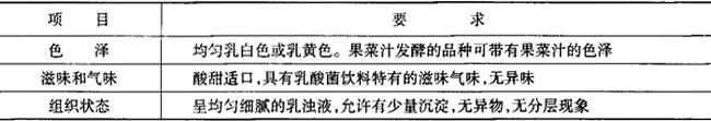 | 释义 | 乳酸菌饮料(摘自QB1554) (一)主题内容与适用范围 本标准规定了乳酸菌饮料的产品分类、技术要求、检验方法、检验规则和标志、包装、运输、贮存要求。 本标准适用于以鲜乳或乳粉、植物蛋白乳(粉)、果菜汁或糖类为原料,添加或不添加食品添加剂与辅料,经杀菌、冷却、接种乳酸菌发酵剂、培养发酵、稀释而制成的活性或非活性饮料。 (二)产品分类 按杀菌和不杀菌分为两类: (1)活性乳酸菌饮料 经乳酸菌发酵后不杀菌制成。 (2)非活性乳酸菌饮料 经乳酸菌发酵后杀菌制成。 (三)技术要求 1.原辅材料要求 (1)牛乳 应符合GB6914的规定。 (2)乳粉 应符合GB5410或GB5411的规定。 (3)白砂糖 应符合GB317的规定。 (4)食品添加剂 应符合GB2760及其他相应食品添加剂国家标准的规定。 (5)其他原辅材料 应符合相应的食品卫生要求。 2.感官要求 应符合表5-2-28的要求。 表5-2-28