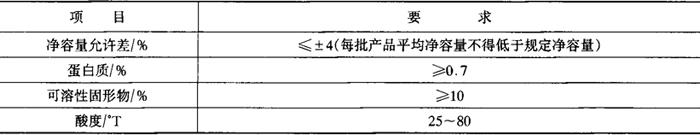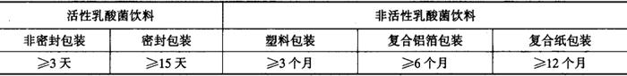 4.卫生指标 见表5-2-6。 (四)检验方法 1.感官 应在感官检验室内或在符合感官检验要求的其他实验室内检验产品的色泽、滋味、气味、组织状态,可按附录A评分。 2.净容量 用精度为0.5mL的量筒分别测量所取样品的体积,取平均值为测量结果。 3.蛋白质 按GB5009.5规定的方法测定。 4.可溶性固形物 按GB12143.1规定的方法测定。 5.酸度 按GB5409中2.1.1条规定的方法测定。 6.砷 按GB5009.11规定的方法测定。 7.铅 按GB5009.12规定的方法测定。 8.铜 按GB5009.13规定的方法测定。 9.乳酸菌数 按GB××××*规定的方法测定。 10.菌落总数 按GB4789.3规定的方法测定。 11.大肠菌群 按GB4789.3规定的方法测定。 12.致病菌 按GB4789.4、GB4789.5、GB4789.10、GB4789.11规定的方法检验。 13.酵母和霉菌数 按GB4789.15规定的方法检验。 *待定标准 (五)检验规则 1.出厂检验 (1)出厂时对每批产品进行检验,并在大包装中附以产品合格证。 (2)出厂检验项目包括:感官要求、净容量、酸度、可溶性固形物、乳酸菌数、菌落总数和大肠菌群。 2.型式检验 (1)型式检验每季度进行一次。有下列情况之一时,亦应进行型式检验。 ①原料、工艺、设备有较大变化时; ②长期停产恢复生产时; ③质量监督机构提出要求时。 (2)型式检验项目包括技术要求2~4的全部规定。 3.抽样与组批 (1)同一班次、同一生产线、同一规格、同一包装、同一品种的产品为一组批。 (2)由检验人员自同一组批产品中,按检验项目的要求随机抽取足量的样品。依产品销售包装容量的大小,每位感官检验者用2~3瓶(盒、袋)进行感官检验;至少取6瓶(盒、袋)进行净容量检验;5瓶(盒、袋)混匀后进行理化检验;5瓶(盒、袋)混匀后进行微生物检验。 (3)活性乳酸菌饮料样品应及时进行检验,不能及时检验时,应贮于2~10℃冷库或冰箱内。 4.判定规则 (1)出厂检验在其全部检验项目均符合相应的指标要求时,判为产品出厂检验合格;出厂检验项目有一项或一项以上不符合相应的指标要求时,判为产品出厂检验不合格。 (2)型式检验在其全部检验项目均符合相应的指标要求时,判为产品型式检验合格;型式检验项目有一项或一项以上不符合相应的指标要求时,判为产品型式检验不合格。 (3)在出厂检验或型式检验不合格时,可自同一组批中再次随机加倍取样进行复验,复验只需测定或检验不合格的项目;复验结果合格时判为产品合格,复验结果不合格时判为产品不合格;但微生物项目(除乳酸菌数外)不合格时则不得进行复验,直接判为产品不合格。 (4)供需双方对检测结果有争议时,由具有仲裁资格的质量监督单位仲裁。 (六)标志、包装、运输、贮存 1.标志 销售包装的标志内容应符合GB7718的规定;产品外包装箱的标志内容应包括: ①产品名称; ②产品件数; ③毛重与净重; ④包装箱外部尺寸; ⑤生产日期与批号; ⑥运输及保存的注意事项; ⑦生产厂名、地址及邮政编码。 2.包装 包装材料、容器应符合相应食品包装材料卫生标准的要求,包装容量不做具体规定。 3.运输 运输工具、车辆必须清洁、卫生,备有防雨、防晒设施。长途运输活性乳酸菌饮料的车辆,必须有隔热或冷藏设施。 4.贮存 (1)活性乳酸菌饮料应贮存在2~10℃的冷库中。 (2)非活性乳酸菌饮料应避光贮存。仓库中相对湿度不超过80%,温度不超过25℃。产品应码放在距墙、距冷热管、距柱0.5m以外、距地面0.1m以上的托板上;码放高度不得超过2m。 (3)产品符合上述贮存条件时,保质期应符合表5-2-30的要求。 表5-2-30 产品保质期