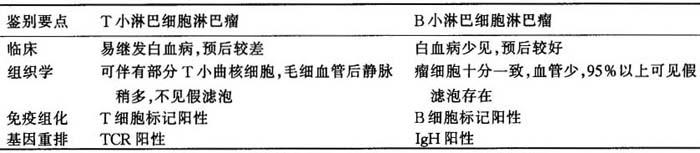 | 释义 | 二、各T淋巴细胞淋巴瘤亚型的鉴别诊断 (一)T与B小淋巴细胞淋巴瘤的鉴别诊断 二者从组织学方面观察十分相似,如仔细观察尚可有些差别(表6-10)。 表6-10 T与B小淋巴细胞淋巴瘤的鉴别诊断