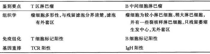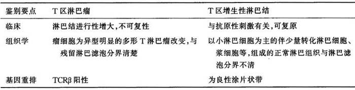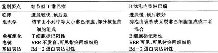 (五)T区淋巴瘤与T区增生性淋巴结的鉴别诊断 由于T区淋巴瘤残留有散在淋巴滤泡,如不注意会与良性T增生性淋巴结相混淆,其鉴别如表6-14。 表6-14 T区淋巴瘤与T区增生性淋巴结的鉴别诊断