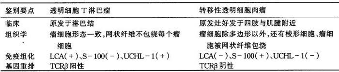 (三)透明细胞T淋巴瘤与转移性透明细胞肉瘤的鉴别诊断 透明细胞T淋巴瘤瘤细胞浆透明,且被小血管分隔略呈“巢状”,与转移性透明细胞肉瘤近似,应予鉴别(表6-12)。 表6-12 透明细胞T淋巴瘤与转移性透明细胞肉瘤的鉴别