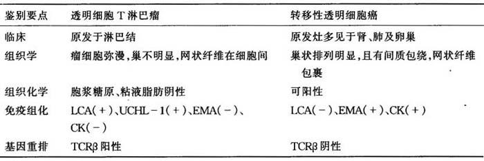 (四)透明细胞T淋巴瘤与转移性透明细胞癌的鉴别诊断 透明细胞T淋巴瘤细胞与透明细胞癌细胞相似,其治疗方法不同。因此应予鉴别(表6-13)。 表6-13 透明细胞T淋巴瘤与转移性透明细胞癌的鉴别诊断