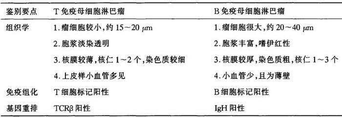 (七)T免疫母细胞淋巴瘤与B免疫母细胞淋巴瘤的鉴别诊断 二者同为免疫母细胞型,HE切片不注意会相互误诊,如仔细观察分析还是有区别之处(表6-16)。 表6-16 T免疫母细胞淋巴瘤与B免疫母细胞淋巴瘤的鉴别诊断
