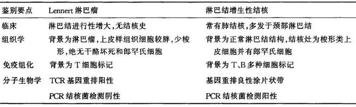 (八)Lennert淋巴瘤与淋巴结增生性结核的鉴别诊断 Lennert淋巴瘤在瘤性小淋巴细胞背景中有散在成簇的上皮样组织细胞,易与淋巴结增生性结核仅见类上皮细胞灶而无干酪坏死时相混淆(表6-17)。 表6-17 Lennert淋巴瘤与淋巴结增生性结核的鉴别诊断