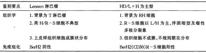 (九)Lennert淋巴瘤与霍奇金病(HD)淋巴组织细胞为主型的鉴别诊断 Lennert淋巴瘤在上皮样组织细胞团中可见到较大的类H/R-S细胞,易误为HD淋巴组织细胞为主型(表6-18)。 表6-18 Lennert淋巴瘤与HD淋巴组织细胞为主型的鉴别诊断