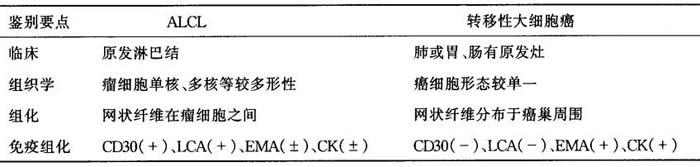 (十)间变性大细胞淋巴瘤与转移性巨细胞癌的鉴别诊断 间变性大细胞淋巴瘤(anaplastic large cen lymphoma,ALCL)是新近命名的一种特殊恶性淋巴瘤。由于它的瘤细胞成团块状浸润,有的多核瘤细胞像花冠样巨细胞,并可有R-S样巨细胞,且CD30(Ki-1)标记阳性,新近WHO淋巴瘤分类中暂定为霍奇金病样ALCL,取代ND-LD。其早期瘤细胞沿淋巴窦浸润,并向淋巴结实质内片、团状浸润。常规切片很难与转移性大细胞(巨细胞)癌相区别,ALCL多数为T细胞标记(表6-19)。 表6-19 ALCL与转移性大细胞癌的鉴别