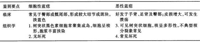 | 释义 | 二、蓝痣 临床:蓝痣好发于臀部、尾骶部,表面皮肤浅蓝色微突起,恶性蓝痣可有溃疡。 组织学:蓝痣痣细胞位于真皮深层,梭形,成束状,与表皮平行,色素颗粒多而粗。有的痣细胞丰富如平滑肌细胞,此型称富于细胞型,易恶性变。良、恶性鉴别如表12-7。 表12-7 蓝痣与恶性蓝痣的鉴别诊断