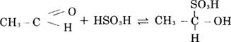 图3-2-4 SO2存在形式 如葡萄酒pH为3.8,活性SO2只占游离SO2约1%;pH为2.8,活性SO2占游离SO2约10%。 (二)结合SO2 SO2可以与葡萄酒(汁)中的醛、糖、色素等化合物结合成稳定性不同的结合SO2(结合亚硫酸)。结合SO2在很大程度上失去防腐性。当酒中游离SO2减少时,不稳定结合SO2能自动分解,产生新的游离SO2,因此可把它看作游离SO2的储备库。 结合SO2的速度开始较快,以后就很快慢下来,例如葡萄汁在亚硫酸处理后5min,几乎一半SO2变为结合态;以后经两昼夜,结合态SO2约60~70%;经过10天,结合态SO2约90%,SO2完全结合是不可能的。 (1)SO2在酒中与乙醛化合生成乙醛亚硫酸: