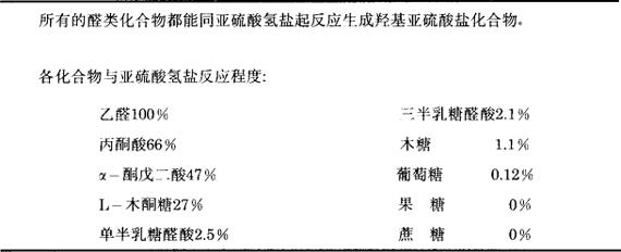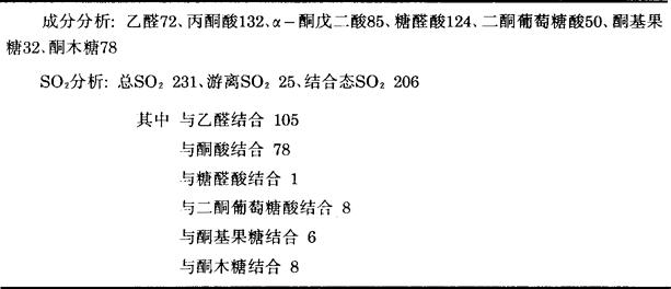 它是一种较稳定的化合物(离解常数很小),是亚硫酸氢盐的加成物。乙醛是糖发酵的中间产物,亚硫酸化后,促使乙醛被掩盖起来。如甜葡萄酒再发酵以后,经亚硫酸处理,与乙醛结合的SO2会大大提高,使SO2在酒中积累。对空气中的氧产生氧化作用也较稳定,在酸或碱的作用下则易分解。 乙醛亚硫酸所具有酸性活力超过葡萄酒本身的那些酸,其中包括酒石酸在内。在佐餐葡萄酒中,亚硫酸与乙醛化合,从而减少了游离乙醛所具有的味道。因此在干酒中适当使用SO2对酒的风味是有利的。 相反,在蒸出的原白兰地贮存过程中,乙醛起着重要作用,并且乙醛必须是游离状态,故乙醛变成乙醛亚硫酸是不适合的。 表3-2-3为SO2与醛类反应的情况。 表3-2-3SO2与醛类反应