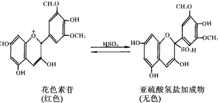 (4)葡萄酒中可以与SO2结合成不稳定化合物的物质大约有15种,其来源: ①存在于完整的葡萄或葡萄汁中的物质,如葡萄糖、阿拉伯糖、半乳糖醛酸、多糖、多酚等。 ②在灰绿葡萄孢感染的葡萄中或氧化糖类细菌感染的葡萄中形成的物质:如二酮葡萄糖和酮基果糖。 ③酵母在正常发酵条件下产生的或生霉葡萄的葡萄汁发酵中积累的物质:如丙酮酸和α-酮戊二酸。 (5)SO2可使葡萄色素成无色,有色葡萄酒或汁用亚硫酸处理后,颜色变淡或成无色。当液体加热或搅拌时,液体中的亚硫酸蒸发或氧化,和色素化合的亚硫酸分解,液体色素被还原。空气中氧对于亚硫酸色素的化合物氧化作用比游离态的色素要小得多,因此也可说亚硫酸处理对葡萄酒和葡萄汁的色泽起保护作用。但在酿制红葡萄酒时,过多地使用SO2也是不当的,因为色泽减弱以后要恢复原来的色泽需要很长的时间。 SO2与花色素苷的作用,说明为什么在颜色较深的葡萄酒中测定SO2困难的原因。