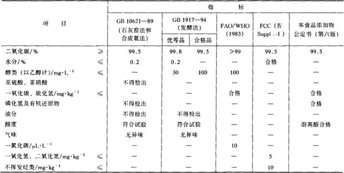 注:除水分含量为质量分数外,其余均为体积分数。 鉴别方法 将本品通入氢氧化钙溶液,生成白色沉淀,滤取出该沉淀,加入乙酸溶液(1+4),产生气泡并溶解。 毒理学依据 1.GRAS FDA-21CFR 184.1240。 2.ADI 无需规定(WHO/FAO,1994) 使用 防腐剂、制冷剂、萃取剂、保护性气体、碳酸化剂。 1.使用注意事项 (1)从防腐的角度来讲,二氧化碳能对微生物起作用是由于:①二氧化碳分压的增高,影响需氧微生物对氧的利用;②二氧化碳能终止各种微生物的呼吸代谢;③如果食品中存在大量二氧化碳,可改变食品表面的pH,而使微生物失去供其生存所必需的条件。但一般来讲,二氧化碳不能杀死微生物,只是抑制微生物的生长。 (2)二氧化碳对于多脂食品、乳制品、快餐食品、花生和其它对氧敏感的干制品的抗氧化作用和在贮藏环境中对水果、蔬菜及谷物呼吸作用的影响,均较其抗菌作用重要得多。 (3)在果汁、软饮料、葡萄酒中的二氧化碳主要起防腐作用,此外它在软饮料中还起清凉作用、阻碍微生物生长、杀死嗜氧微生物、突出香气以及赋以饮料舒适的口感。 2.使用范围及用量 我国《食品添加剂使用卫生标准》(GB 2760-1996)规定:上述五种方法所制取的二氧化碳均可按生产需要适量用于碳酸饮料和汽酒类。 各品种汽水参考含气量如下表所示: 各品种汽水参考含气量