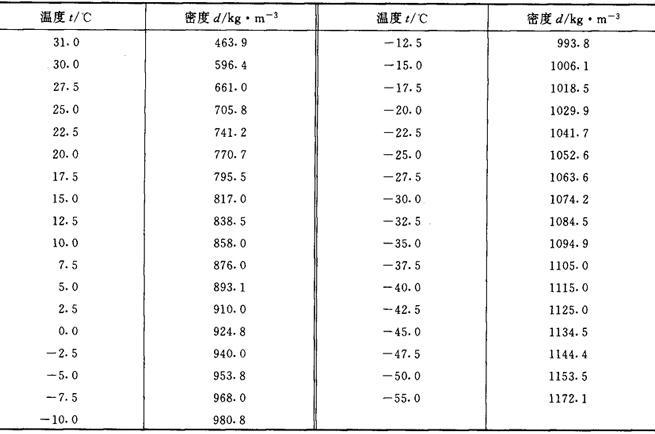 | 释义 | 二氧化碳的物理性质 二氧化碳是一种无色、无味、无毒物质。化学分子式为CO2。相对分子质量为44。在101.3kPa压力下沸点为-78.52℃。临界温度为31.0℃,临界压力为73.8×10-5Pa,临界比体积为2.456m3/kg。凝固温度为-56.6C。固体二氧化碳又称干冰,干冰的分子结构与特性是稳定的。二氧化碳是一种良好的制冷剂和食品添加剂。 (一)液体二氧化碳的密度 液体二氧化碳的密度受压力的影响甚微,而受温度的影响较大。液体二氧化碳的密度见表1-2-9。 表1-2-9 液体二氧化碳的密度