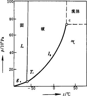 图1-2-2 CO2相图 图中蒸汽压曲线Ig始于三相点(气、液、固三种状态共存点)Tr,终止临界点c在三相点上,tTr=-56.42C,pTr=5.19×105Pa,气液固三相呈平衡状态。而在临界点c附近,气液两相形成连续的流体相区(用虚线画出的区域)。流体相既不同于一般的液相,也有别于一般的气相。c点所对应的温度tc=31.16℃,压力pc=7.16MPa,其临界体积Vc=94mL·mol-1。Is作为熔化压力曲线始于三相点Tr,随温度、压力的增加一直向上延伸,在-40℃时压力曲线可达7.09×108Pa(709MPa)左右。gs为升华曲线,其压力为固体二氧化碳在某些温度下的蒸汽压。 |