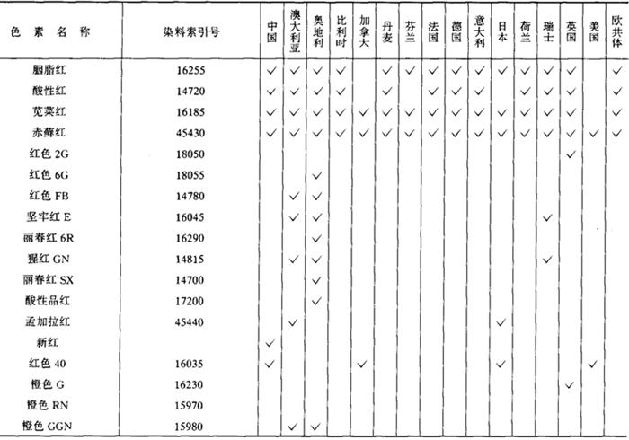 附表8-2 一些国家和组织许可使用的食用合成色素