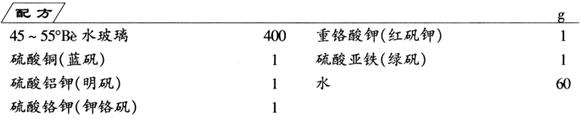 将水加热至100℃,再将除水玻璃以外的其余组分加入,继续加热搅拌至全部溶解,冷却至55℃左右,再加入水玻璃,随加随搅,直至颜色一致,大约30min内,即得到五矾防水剂。