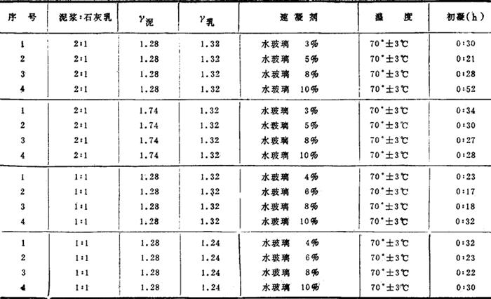 图3-2-75 不同比例的石灰乳、胶质泥浆的流动度 ③快干石灰乳泥浆配方 在高比例石灰乳胶质泥浆中,加入2%的烧碱(重量)和1~3%的水玻璃(体积),可加快凝固时间,提高堵漏效果。其初凝时间随水玻璃加入量而不同,应按室内试验数据与现场实际配制。 ④石灰乳堵漏注意事项 Ⅰ 在配制时,烧碱必须先加入石灰乳中,它能改善石灰乳的流动度。其方法为:将烧碱溶于配制石灰乳所用之定量水中,其重量应为试验配方中烧碱之加量。 水玻璃直接加入新泥浆中,应搅拌均匀,加入后必须不停搅拌,否则会很快冻结成块,造成泵送困难。因此水玻璃必须在其他一切施工都准备就绪后再加入泥浆中。 Ⅱ 烧碱石灰乳液和水玻璃泥浆在地面配制时应严格分开进行。注入时可以用水泥车单注石灰乳,另用水泥车或泥浆泵注泥浆或水玻璃泥浆,使其在钻具内混合。或者分别从环形空间和钻具内注入,在井下进行混合。 Ⅲ 注石灰乳泥浆过程,以不带钻头和钻铤为宜,钻杆可下至漏层附近。 Ⅳ 施工中,不论任何情况,均不得中断,特别是在石灰乳泥浆未替至井底前,短时间的停泵也会造成蹩泵。在石灰乳泥浆替出钻具之后,必须经常上下活动钻具。 Ⅴ 候凝24h后,循环试漏,不漏即可接钻头下钻,通井钻井。在石灰乳井段要逐根划眼,注意蹩泵和卡钻。漏层处不宜过多循环划眼,以防冲漏。 Ⅵ 在封堵有进无出的漏层时,可从钻杆内注石灰乳,同时从环形空间注入水玻璃泥浆,其替泥浆排量应控制至使石灰乳和水玻璃泥浆两者同时到达井下混合,推至漏层位置。 (2)快干水泥试验配方 见表3-2-135。 表3-2-135 快干水泥试配方