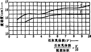 注:(1)水玻璃用量,按泥浆与石灰乳总体积计算。 (2)石灰乳的相对密度应不低于1.2,相对密度越大越好。 ①低比例石灰乳泥浆石灰乳(相对密度1.4±)与泥浆(相对密度1.4以上)相配合。 石灰乳:泥浆=1~5∶10(体积)。此配方具有在高温条件下固化速度慢,流动度差,可塑性大的特点,适用于低压水层的堵漏。 ②高比例石灰乳泥浆石灰乳:泥浆=2~1∶1(体积)。高温固化,但强度低,适用于深井堵漏。图3-2-75是不同比例的石灰乳,胶质泥浆的流动度。曲线I是石灰乳的相对密度为1.35,泥浆的相对密度为1.40。曲线Ⅱ是石灰乳和泥浆的相对密度均为1.40。