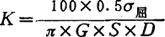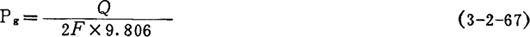 式中 σ屈——钢材屈服强度 π——圆周率 G——钢材剪切弹性系数 S——安全系数=1.5 D——钻杆外径(cm) 4.卡钻时千斤上顶计算 (1)油顶压力计算 Q=(1+f′)qL (3-2-66) 式中 Q——油顶所承担的负荷(kg) f′——上顶计划超出钻具重量之系数(取0.3) q——钻具每公尺重量(kg/m) L——钻具总长(m) 压力表上显示之压力(用双千斤顶时):