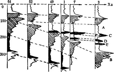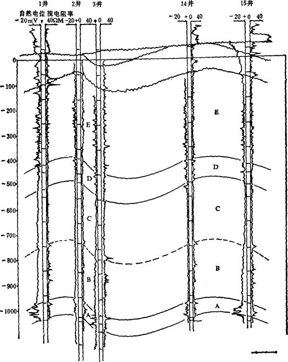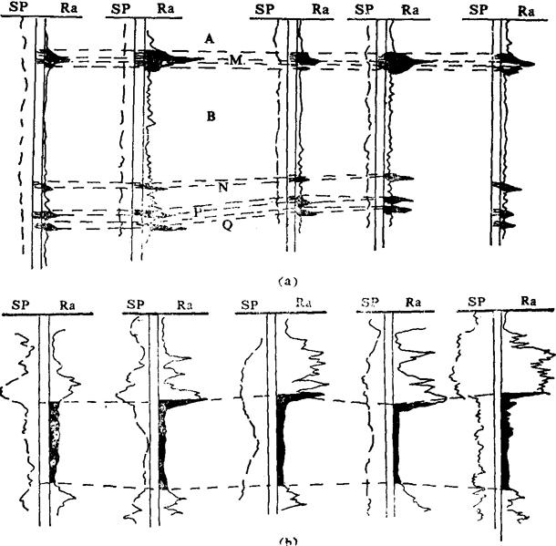 图3-1-38 电测标准层对比图 a-用页岩作标准层 b-用泥岩作标准层 SP-自然电位 Ra-视电阻率 2.应用测井曲线进行地层对比 可以确定地层在空间的分布情况和岩性变化规律,找出盐、卤矿层富集的有利地区,预测钻探目的层,并找出单井剖面上地层岩性特征的反映及不同层系的地层组合沉积韵律等。 3.绘制综合地层对比图 由于各组、段地层在测井曲线上均有明显的特征,根据曲线的形状幅度和上下层段的组合特征等,可把各井剖面分成若干大段,然后再进一步分成许多小层组,详细地逐层对比。最后分探区、分目的层把各井组相应的标准层和各系、组、段、层用对比线加以连接,绘制出地层对比图。如图3-1-39、图3-1-40。