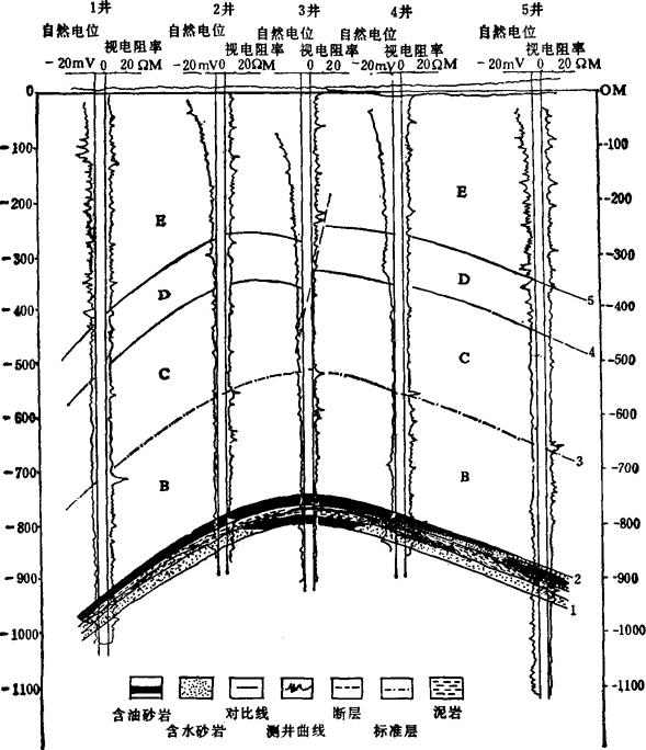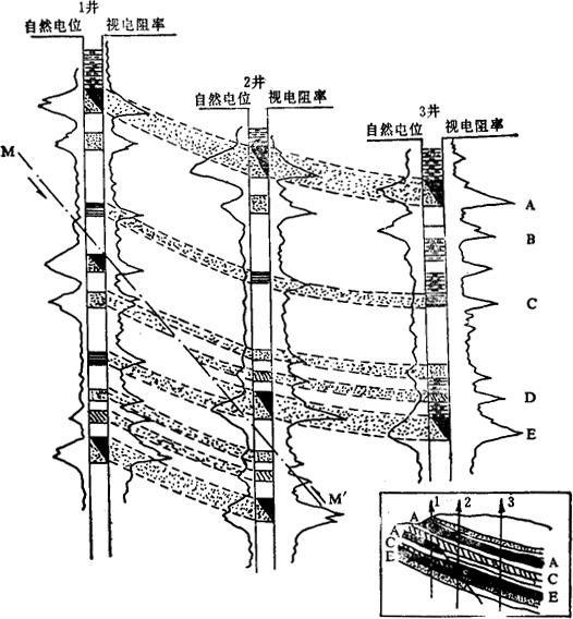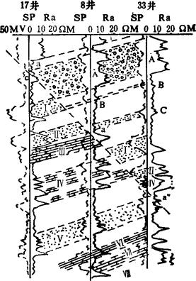 图3-1-43 测井曲线对比确定地层特征的实例