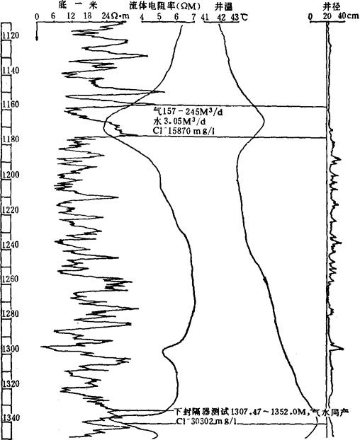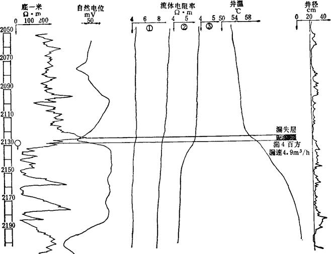 图3-1-44 用流体、井温测井判断气、水层 5.利用测井曲线划分盐岩层 (1)当采用水基泥浆钻井时,造成盐岩层的溶解,视电阻率分流严重;当电极排列较小时,则出现电阻率低异常显示(纯盐岩电阻率值为107-9Ω·m)的假像,曲线拐点正对盐岩层顶、底板位置。井径曲线显示扩径,曲线的陡急处正对盐岩层顶、底板位置。自然伽马曲线显示低异常读数,如扩径大于45cm,超过仪器的探测范围,更是低异常读数。井内流体电阻曲线呈低异常显示。 (2)当钻孔采用抗盐泥浆体系时,盐岩层得到了保护,不扩径或微小扩径。当用较大电极排列时,则出现视电阻率曲线异常幅度略低于上下围岩(羔盐、碳酸盐岩剖面)或高于上下围岩幅度(砂、泥质剖面)。自然伽马曲线低异常显示。井径曲线不扩径或显示微小扩径。 (四)应用测井曲线定性判断储集层含气、水情况 在井矿盐钻井中,由于强烈的井眼分流和严重的邻层屏蔽影响,探测范围不大的测井方法只能反映泥浆侵入区的物性,不能判断油、气、水的差别;而要结合钻井过程中的显示情况并应用井温及流体等工程测井方法进行定性判断。通常地层水与泥浆的温度和矿化度不同,因而会产生热对流和离子扩散。当地层水进入井中,使局部热场升高(当地层温度高于泥浆温度时)、泥浆电阻率降低(当地层水矿化度高于泥浆矿化度时)。当天燃气进入井中,发生吸热膨胀,使气侵井段显示低温异常,如图3-1-44所示。 在井段1157.5~1175m和1133.5~1341m处显示为水层特征:流体电阻率曲线降低,井温曲线显示高温异常。原因是地层水的离子扩散快,热对流快。井段1294.5~1298m处为绿豆岩、泥岩,其流体电阻率显示低值,这是井径扩大、下部低矿化度水向上扩散,浇井不均匀所致。 (五)确定井下漏失层位 在泥浆柱压力大于地层的条件下,漏失层段泥浆侵入较深,并大量漏入地层,而产生井温异常和井内流体异常幅度。图3-1-45为利用井温和流体电阻率测井确定漏层的实例。