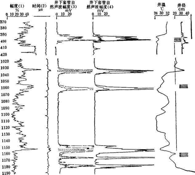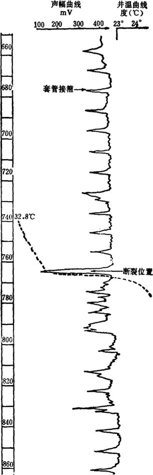图3-1-46 应用声波和井温测井确定管外窜流 图中3、4为关闭仪器声源的自然声波测井曲线,声幅大的位置就是窜气位置;同时井温曲线显示低温幅度异常。判断1041~1077m和1145~1180m处为主要出气层段,井深385~405m处为主要进气层段。 (七)确定套管断裂位置 声波通过套管断裂位置时,波幅大大衰减,在曲线上呈低异常幅度显示,和正常的套管接箍幅度差别很大;并且套管断裂处有泥浆漏失,井温曲线出现急剧降温异常。如图3-1-47所示,井深765~766m处为套管断裂位置。