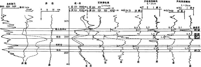 图3-1-48 检查酸化压裂效果测井曲线图 图中以泥质层的电导率幅度为1(假定酸化前后不变),则渗透层1的相对幅度值为:深侧向0.8~2.1;浅侧向0.6~2.5。说明在该层酸化压裂后,裂缝扩大和沟通,电导率增大,电阻率降低(如底1米石灰岩电极)。因此可判断渗透层1为吸酸层位,而且酸化压裂效果好。 |