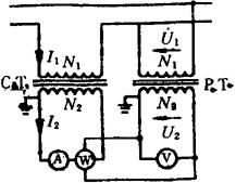 | 释义 | 交流比例技术及交流电量测量仪器的检定 1.交流比例技术 各种交直流转换器件、电路和交流电量测量仪表的测量范围都有一定的限制,对于高电压、大电流和小电压、小电流,一般都需通过交流比例设备将其转换成适应于变换器和仪表的测量范围,因此,交流比例技术在交流电量的测量中应用得非常广泛。最常用的交流比例设备为电压互感器和电流互感器。下面仅对专用于测量的互感器的原理予以简单介绍。 电压互感器PT的一次绕组并联接在被测线路上,二次绕组并联接测量仪表;电流互感器CT的一次绕组串联接在被测线路上,二次绕组串联接测量仪表,原理线路如图6.5-10所示。图中N1、N2分别表示互感器的一次和二次绕组,U1、I1为被测线路的电压和电流,即互感器一次绕组输入的一次电压或一次电流;U2、I2为输入测量仪表的电压和电流,即互感器二次绕组输出的二次电压或二次电流。被测线路的电压或电流可通过测量仪表测得的电压或电流由下式计算得: