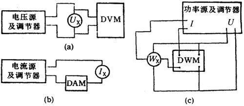 图中:Ux、Ix、Wx-分别为被检电压表、电流表和功率表; DVM-标准电压表;DAM-标准电流表;DWM-标准功率表。 图6.5-14 用数字表检定仪表的接线图