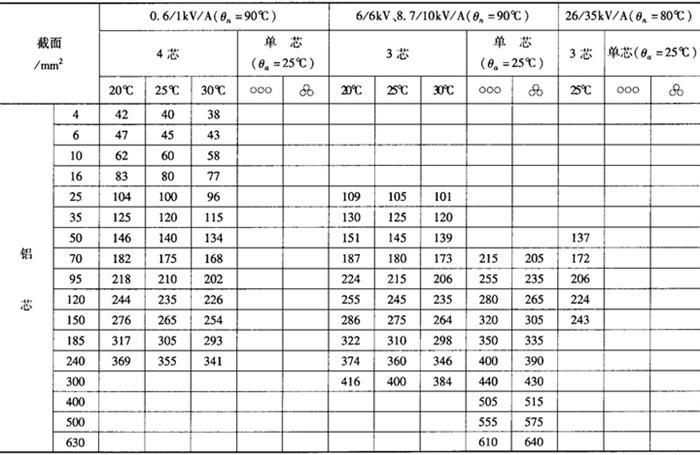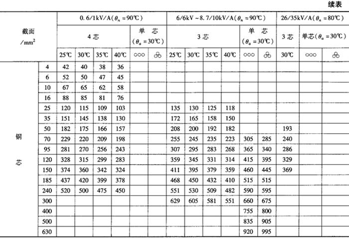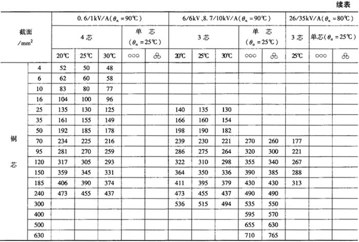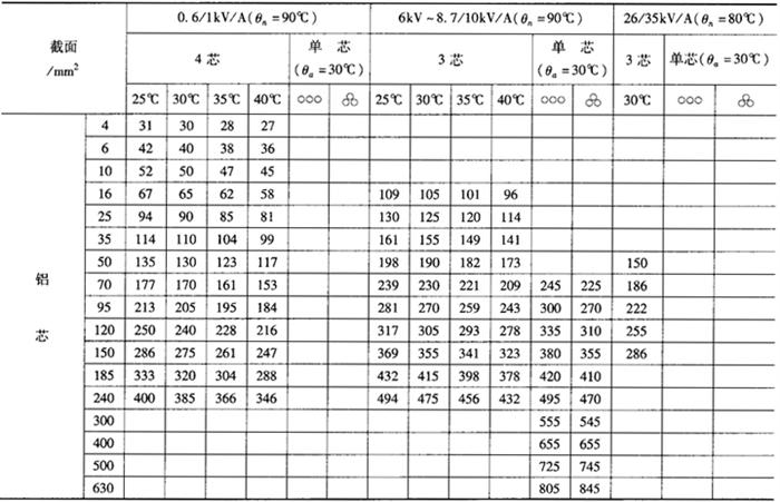 | 释义 | 交联聚氯乙烯绝缘电力电缆的载流量 交联聚氯乙烯绝缘电力电缆在空气中及直埋地敷设的载流量列于表12-34、表12-35。 表12-34 交联聚乙烯绝缘电力电缆在空气中敷设的载流量