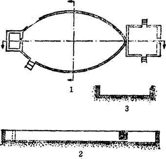 图2-12 椭圆形产卵池 1.平面图;2.剖面图;3.集卵池