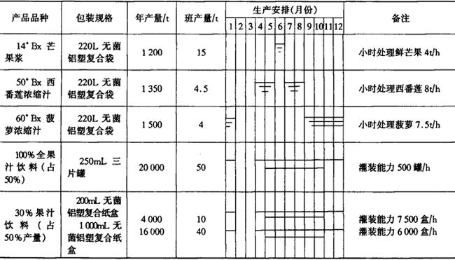 表6-4-2 西南地区某饮料厂年产4000t浓缩果汁及40000t果汁饮料的产品方案