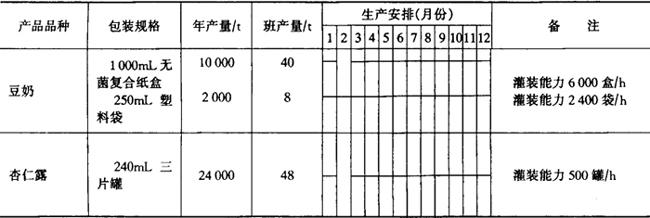 表6-4-4 北方地区某饮料厂年产植物蛋白饮料35000t产品方案