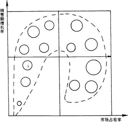 图13-4 PPM图 采用PPM分析,首先以产品市场占有率和销售额增长率交点为圆心,以销售额按一定比例折合成长度为直径作图,然后分析PPM图。图13-5产品分布呈月牙形,是发展型企业。