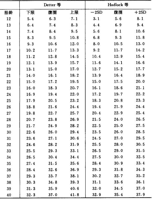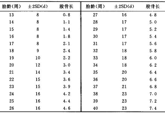 (5) 胎儿肢体的测量 1)股骨(FL) 对估计胎龄及发现胎儿有无短肢畸形具有实用价值,还可推测胎儿死亡时间,测量方法是找出股骨最长轴,自远侧骨骺端至近端斜面中点之间的距离。 查表法,见表3.4.6。 表3.4.6 股骨长与孕龄的关系(cm)