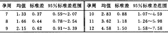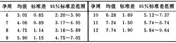 (2)坐高的测量 坐高系指胎儿头顶至臀部的最大距离,此径线变异小,被认为是最准确的估计胎龄的方法,寻找胎儿坐高最长轴,测量3次,取其平均值,测量时间以孕6~13周为宜。 1)公式计算法 孕周=胎儿坐高+6.5 2)查表法 胎儿坐高与孕龄的关系:孕7~12周坐高测值(cm),见表3.4.2。 表3.4.2 胎儿坐高与孕龄的关系(cm)