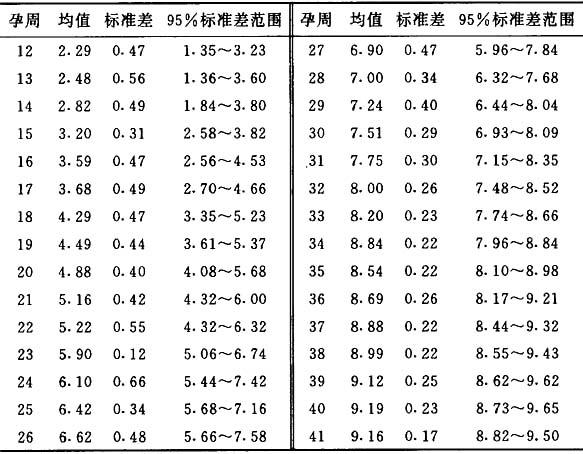 (4)胎儿腹部的测量 标准平面,切面在胎儿脐部水平,与脊柱垂直,可看到四个结构:脊柱、胃泡、肝脏、脐静脉,不应看到胎儿心脏和肾脏。 腹围(AC)采用标准平面,沿胎儿腹部外缘描迹,获得腹围数值或胎儿腹围周长=(A+B)π/2(A为胎腹前后径,B为腹横径)。查表法,见表3.4.5。 表3.4.5 腹围与孕龄的关系(cm)