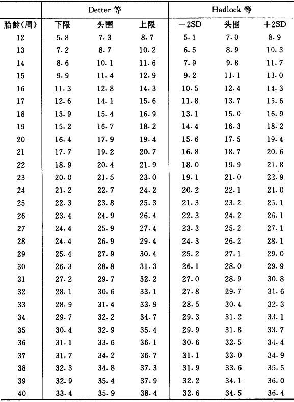 (3)胎儿头部的测量 孕12周以后颅骨图像清晰可作胎头测量。常用的是双顶径及头围。 标准平面即丘脑平面,测量时探头与胎儿长轴垂直,颅骨光环呈椭圆形,中线居中,中线1/2处两侧各出现两半圆低回声区,合成椭圆形的丘脑,其前方可见三个短光条,即是第三脑室及透明膈。 1)双顶径(BPD) 先找到胎头标准平面,测量其最大横径,测量时从近侧颅骨壁外缘测量到远侧颅骨壁内缘。胎头双顶径于孕31周前平均每周增大3mm,孕31~36周平均每周增大1.5mm,孕36周后平均每周增大1mm。 查表法 胎儿双顶径与孕龄的关系,见表3.4.3。 表3.4.3 双顶径的测量值与孕龄的关系(cm)