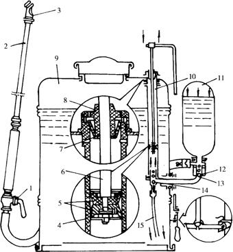 图7-3 工农-16型喷雾器 1.开关 2.喷杆 3.喷头 4.固定螺母 5.皮碗 6.塞杆 7.毡圈 8.唧筒帽 9.药液箱 10.唧筒 11.空气室 12.出水球阀 13.出水阀座 14.进水球阀 15.吸水管 2.工作原理 工作时,用手上下掀动摇杆,塞杆在泵筒内作往复运动。当塞杆带动皮碗上行时,皮碗下面的腔体容积增大,形成局部真空,在压力差的作用下,药液桶内药液冲开进水球阀,沿着进水管进入泵筒内,完成吸水过程。而当皮碗从上端返回时,泵筒内压力增高,将进水球阀关闭,出水球阀打开,药液即通过出水阀进入空气室,空气室内的空气被压缩,对药液产生压力,打开喷射开关后,药液即经过喷头变成细小的雾滴喷出。 |