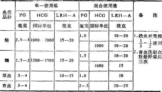 | 释义 | 人工催产药物的配制与使用 (1)剂量 不同鱼类或同种鱼类在不同催产时期及不同成熟状况与水温条件下的药物往往有差别。有时使用一种催产药物,有时使用二种或二种以上的不同催产药物混合使用,催产剂量也有不同变化。四大家鱼每公斤亲鱼注射剂量见表2-14。 表2-14 每公斤雌亲鱼注射不同催情剂量表