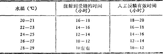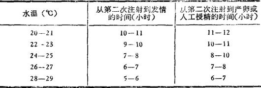催产用的注射器与针头要消毒,生理盐水要保持清洁无污染。脑垂体要低温干燥保存,使用时要检查质量,认真计量。 (2)注射方法 目前用二次注射法,即第一次注射时与第二次注射相隔12-24小时,第一次注射的剂量为总剂量的1/10-1/6,第二次注射余量。亲鱼第一次注射后最好放在小池塘中,待第二次注射后再放入产卵池中。 青鱼常用三次注射法进行催产,即第一次注射总剂量的1/10;再待12-24小时后注射余量。在水温26-28℃时经过8小时左右即可产卵。鲢鳙鱼用LRH-A的排卵素2号,做第一次注射时一般每尾注射3-5毫克即可。草鱼对LRH-A较敏感,采用一次注射即可。 (3)注射部位 由胸鳍或腹鳍基部注入腹腔的方法称腹腔注射,由鱼体背脊二侧注入肌肉的称肌肉注射,由背鳍后端基部注入的称背脊注射。一般大个体亲鱼采用腹腔注射与鳍基注射。 不管采用那种注射方法都应使亲鱼处于比较安定的状态;进针时操作要轻,部位要准。注射时,一旦亲鱼燥动,应立即拔出针头,切勿强行注射。 (4)产卵时间 “四大家鱼”人工繁殖时的产卵时间应安排在凌晨4-6时,采用人工授精方法时,应安排在傍晚开始至当日晚10时以前结束为宜。产卵时间的掌握主要根据当时水温情况及效应时间,通过控制注射时间来掌握。效应时间是亲鱼催产药物全部注射后至开始发情产卵过程所需要的时间,详见表15和表16。 表2-15 家鱼二次注射后的效应时间与水温的关系