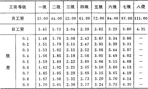 注:本表为第六类地区(辽宁)建筑安装工人日工资标准。 ②附加工资 按地区的规定和现行企业标准综合确定 ③工资性质的津贴 包括粮煤补助及副食价格补贴,按照主管部门规定计算,计入工人工资内。 |