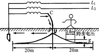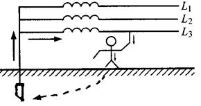图11-3 两相触电 (4)跨步电压触电:如图11-4所示。由于外力(如雷电、大风)的破坏等原因,电气设备、避雷针的接地点,或者断落电线断头着地点附近,将有大量的扩散电流向大地流入,而使周围8~20m的地面上形成大电场,此电场分布着不同的电位而以接地点(或着地点)的电位为最高。当人的脚与脚之间同时踩在不同电位的地表面两点时,会引起跨步电压触电。