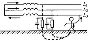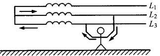 图11-2 电网中性点不接地的单相触电 ①在1000V以下,人碰到任何一根火线后,电流从这根火线经过人体到大地再分成两路到另外两根火线及对地绝缘阻抗而形成回路。如果线路对地绝缘良好,通过人体的电流就小,危险就小。如果线路对地绝缘不良,就有触电危险。 ②在6~10kV,由于电压高,因此触电大,很危险。 (3)两相触电:如图11-3所示。人体不同部分同时接触两根火线,人体承受的电压为两根火线间的线电压。流过人体的电流为I人=U线/R人,显然两相触电比单相触电更危险。
