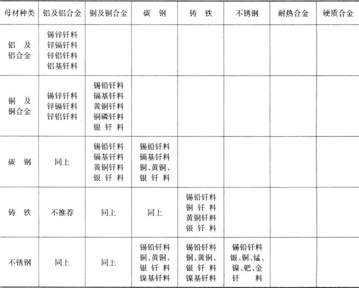 | 释义 | 从母材种类考虑 一般说来,从母材的种类考虑选择钎料时,主要考虑钎料润湿性、钎料与母材相互作用特点、钎焊温度、热膨胀、色调等。表10.4-1为从母材的种类考虑钎料类别。 表10.4-1 根据母材的种类选择钎料