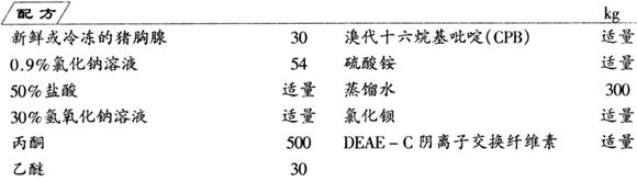 制法 (1)提取 将采集的新鲜或冷冻的猪胸腺用绞肉机绞碎,倒入搪瓷桶中,加入2倍量的0.9%的氯化钠溶液,用50%的盐酸调节pH值至3.0,然后在10℃以下,搅拌提取4~5h。用四层纱布过滤,滤渣可加1倍质量的0.9%氯化钠溶液,再提取1h左右。合并两次提取液,用30%的氢氧化钠溶液调节pH值至7.0左右,在80℃的条件下保温15min,然后冷至10℃以下,离心除去杂蛋白,收集澄清液。 (2)沉淀 把澄清液移入另一搪瓷桶中,在搅拌下加入预冷至10℃以下的冷丙酮(加量为澄清液体积的5倍),然后静置4~5h,用绸布滤除丙酮液(可回收丙酮),收集沉淀,用丙酮、乙醚脱水,得淡黄色丙酮粉。 (3)除杂蛋白 将淡黄色丙酮粉溶于6倍体积的pH值为7.0、0.01mol/L CPB溶液中,搅拌30min,收集离心液(沉淀后可再处理一次),加入25%硫酸铵,调节pH值至7.0,静置3~4h。再收集离心液,用50%盐酸调节pH值至4.6,加25%硫酸铵,搅拌30min,在4℃下静置2~3h,用离心机收集沉淀。 (4)透析 把沉淀溶于5倍质量的蒸馏水中,调节pH值至7.0,然后装入透析袋中对冷蒸馏水透析至无硫酸根离子(用氯化钠检查无白色沉淀为止),再用pH值为7.0、0.01mol/L CPB溶液透析10h左右,将透析液离心,收集上清液。 (5)柱层析将离心液经DEAE-C柱吸附,然后用pH值为4.0的0.002mol/L CPB溶液洗脱,收集洗脱液,加入4倍量体积的冷丙酮,搅拌均匀后,静置3~4h,过滤收集沉淀。 (6)除杂质 把沉淀物溶于冷的蒸馏水中,用30%的盐酸调节pH值至6,然后加入等量乙醚剧烈搅拌1h左右,用离心机离心(20min,1500r/min),收集离心管中层清液(用吸管吸),再用等量乙醚处理清液2次,合并清液,加入5倍体积的冷丙酮,搅拌均匀,静置2~3h,滤除丙酮液(回收丙酮用),收集丙酮粉,即可出售给制药厂灌封用。 胸腺位于猪胸腔前部,10~12月龄猪的胸腺体最发达,每头猪的胸腺为20~65g。猪胸腺柔软呈灰黄色或淡黄色,外部结缔组织被膜具有明显的小叶结构,与胰脏很相似。采集应确保新鲜。 胸腺素是很有发展前途的药物,主要用于自身免疫病症,还可治疗重症肝炎、类风湿性关节炎、系统性红斑狼疮、复发性口疮。国外主要用于治疗原发性细胞免疫缺陷病和某些肿瘤。 |